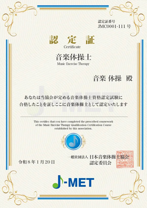音楽体操士資格認定講座に合格すると、「認定証」が1か月前後でご登録住所に発送されます。さらに、当協会が提携している「一般財団法人 日本介護検定協会」からも「認定証」が発行され、双方から「音楽体操士」として認定されます。